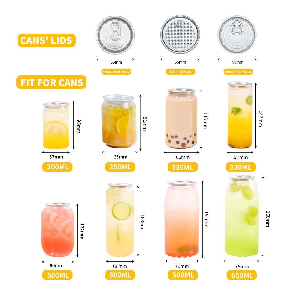 The machine works with tin and plastic cans featuring 55mm lids. It's compatible with a wide range of can sizes, including 200ML, 250ML, 330ML, 500ML, and 650ML (both regular and tall shapes). Avoid using cans with deformed lids or extreme-size deviations, as they may cause sealing issues.