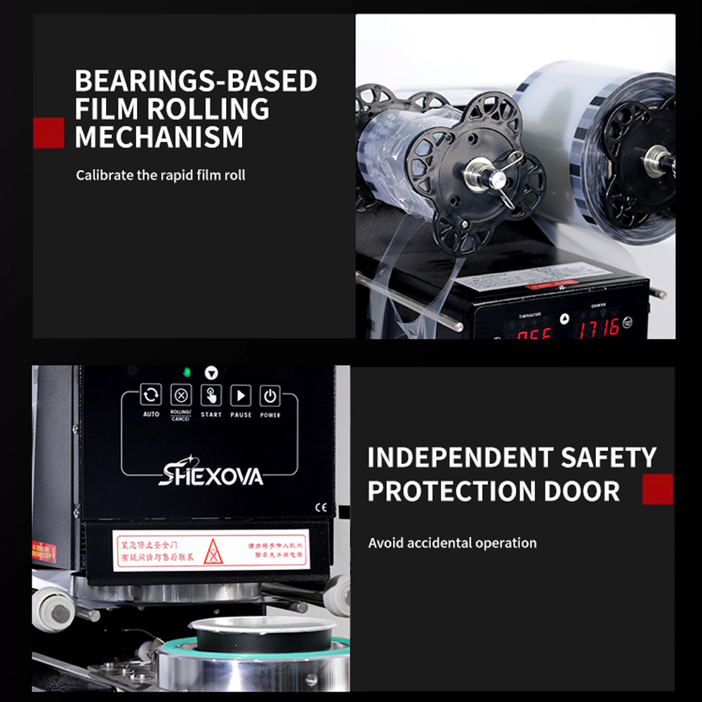 Designed for ease of use with no complex training required. The step-by-step process includes: loading film rolls, adjusting cup guides and settings, automatic cup detection, precise sealing, and quick ejection. Cleaning is simple with a damp cloth wipe-down after use (ensure machine is unplugged first).